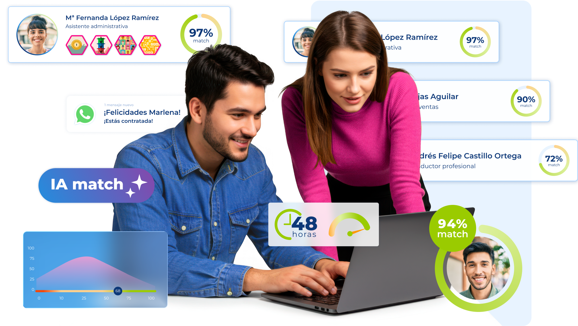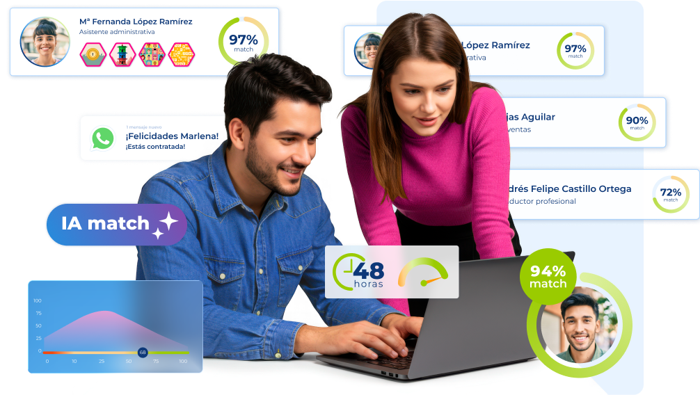 Personaliza tu proceso de selección automatizando el filtrado, el seguimiento y la comunicación con el candidato. Usa la Inteligencia Artificial para obtener rankings de los candidatos más adecuados para el puesto.